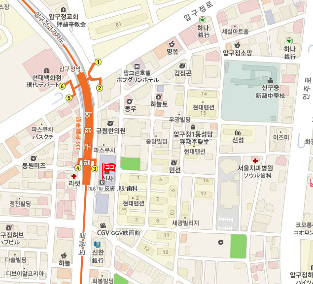 現地 アクセス  地下鉄3号線のNo.336 狎鴎亭(Apgujeong)駅3番出口を出てすぐ。