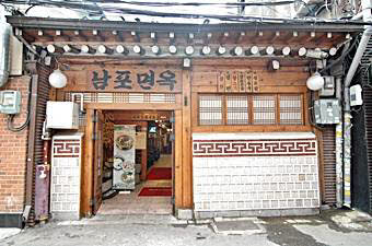 韓国の麺料理といえば、冷麺(ネンミョン)、カルグッス、チャンチククス、ラミョン、ウドン、ジャジャンミョン、チャンポンなど、いろいろありますが、やはり冷麺とカルグッスが代表格でしょう。その証拠に、例面専門店やカルグッス専門店があちこちにあります。この「南浦麺屋(ナンポ・ミョノック)」は、そんな冷麺の専門店の代表格。40年以上の伝統を誇る平壌式冷麺とチェンバン(平壌式麺入り鍋)を食べることができる有名なお店です。入り口には冷麺に欠かせないトンチミ(水キムチ)を漬けてある瓶がずらりと並んでいます。