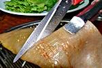 テジコッテギ(豚の皮)は、辛目のソースをつけ鉄板で焼き上げるとクルッと丸まりますので、食べやすい大きさに切って食べます。 これはオカズというより、どちらかというとお酒のおつまみにぴったりな料理。皮の弾力と歯ごたえがクセになるという人も。