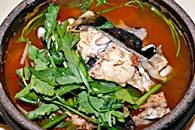 こちらは韓国ならでは辛く煮込まれたフグのメウンタン。辛い中にフグの淡白な味がきいています。 釜山の近くにフグの漁場があるため比較的安くフグが食べられるのが魅力。