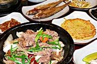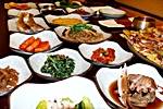 韓国料理の醍醐味といったら、テーブルの上にずらりと並んだ料理の数。特に韓定食は、いったいいくつお皿があるのか判らない程テーブルいっぱいにお皿が並べられます。この「クンチップ」は韓定食が中心のお店。オカズの数の多さと、種類の多様さ、そして家庭的な味が評判のお店です。このお店の基本メニュー「クンチップ定食」を注文すると、キムチ2~3種類、ナムル2~3種類、チャプチェ、プルゴギ、焼き魚、ジョン、塩辛、豆の入ったご飯、テンジャンクッなどがテーブルに並べられます。どれからお箸をつけたらいいか、迷ってしまうぐらい、どれも食欲をそそるものばかりです。