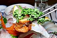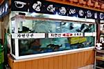 フェ(刺身)を注文すると、最初に付きだしが並び、次にメインの刺身、最後のしめにメウンタン(魚のアラのスープ)が出てきます。まず、付きだしの種類の多さと量が半端ではありません。サラダや天ぷら、焼き魚、貝のスープ、おすし、ジョン、煮付けなど、テーブル一杯に小皿が並びます。次にメインのお刺身。生け簀の中の魚をその場で下ろして出してくれます。韓国では白身魚を主に刺身で食べますが、プリプリした歯ごたえはマグロとはまた違った美味しさです。韓国ではサンチュなど葉野菜にコチュジャンやサムジャン(薬味入り味噌)と一緒に刺身を包んでも頂きます。お刺身を十分に堪能した後はメウンタンでご飯をどうぞ!