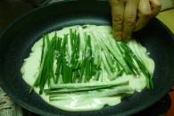 ◇小口ねぎをフライパンの長さにあわせ約10センチ程度の長さに切りそろえます。切った小口ねぎを形よく整えます。