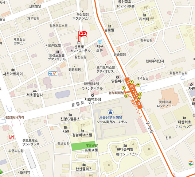 6016番(瑞草・教大方面行き)バスに乗り、南部ターミナルにて下車。徒歩約5分。