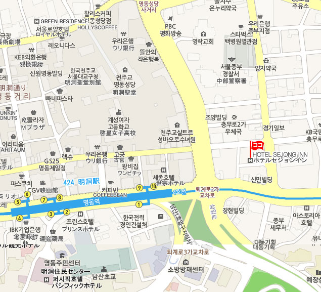 6001番(市内行き) バスに乗り、4号線明洞(ミョンドン)駅・世宋ホテル下車。(徒歩5分)