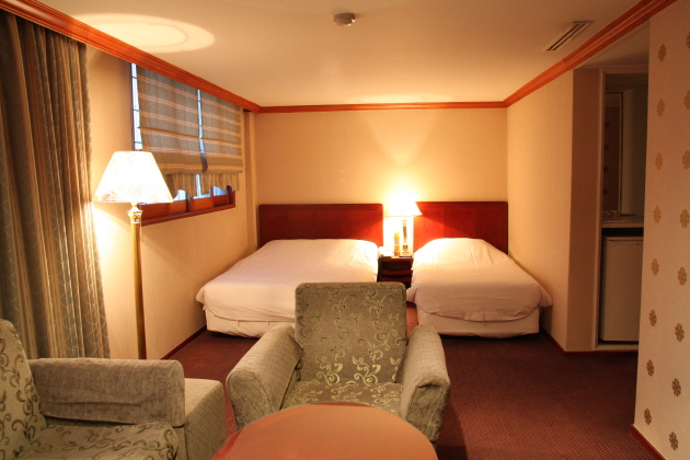 客室の広さは約8坪。夏は涼しく、冬は温かなオンドル床。布団2組。 シングルベッドとダブルベッドが配置されたベッドルームとオンドル部屋の2ベッドルームタイプ。客室の広さは約12坪。