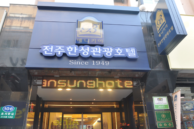 KTXが発着する全州駅からタクシーで15分の繁華街に位置し、周辺には地元の人が利用する食堂が並んでいますので食事に不便はありません。近頃人気の高い三川洞マッコリタウンや全州韓屋村、朝鮮王朝ゆかりの地、慶基殿もタクシーで10分以内と観光にも便利です。客室は2009年に全面リニューアルされ、また全室禁煙ですので匂いが気になる方にも安心してご利用頂けます。ホテル入口が狭く、少々分かりづらいですが、青い看板を目印にお越しください。