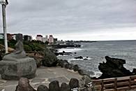 済州市内の海岸にある竜頭岩は、高さ10m位の岩で長い歳月にわたり波によって浸食され、岩の形がちょうど龍が口を開けて海から上がろうとしている姿に似ているところから龍頭岩と名づけられました。 伝説では、その昔一匹の竜が漢拏山の玉を盗んで逃げようとしたところ、怒った山神に矢で射られ、苦しみながら体が海に沈むような姿で岩となったという逸話が残っています。