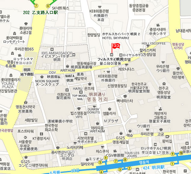 • 地下鉄 : 空港鉄道A`REXに乗車し弘大入口駅下車後、地下鉄2号線 乙支路入口駅5番と6番出口の中間の出口から徒歩7分