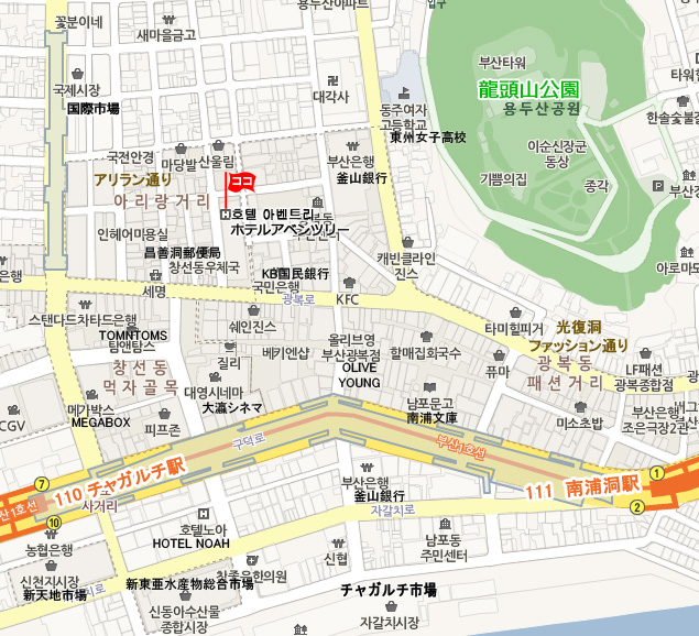 •  金海空港から:①西面・釜山駅方面行き空港リムジンバスに乗車し、南浦洞にて下車後徒歩約5分。②タクシーで約30分