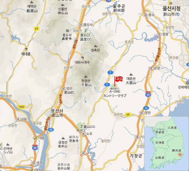 A-ONEカントリークラブは釜山市内から車で約1時間、梁山(ヤンサン)市内からは30分の距離にある1999年にオープンしたゴルフ場で、自然の地形をそのまま活かしたコースとそれを包む自然の景観が美しさが特徴となっています。A-ONEカントリークラブのコースは広く取られたフェアウェイと深いバンカー、適所に配置されたウォーターハザード、そして青々としたグリーンが、自然を活かしたアップダウンの激しい地形にレイアウトされた印象的なコースです。