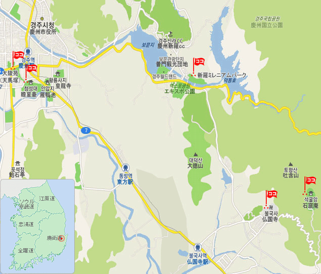 新羅時代の7世紀、善徳(ソンドク)女王の時代に建てられた東洋最古の天文台。瞻星台は陰暦の一年を表す365個半の石で組み立てられ、中央部分の四角い窓で上下12段に分かれており、これは一年の12ヶ月、24節気を表し科学的に計算された造りになっています。天文台としては、梯子を使って中央の窓から入り、天空の観察を行ったとされています。1962年に国宝に指定されました。 国立慶州博物館は約10万点の文化財を所蔵し、そのうちの約2500点を一般に公開し、先史時代から朝鮮時代までの韓国の歴史がひと目でわかるようになっています。特に新羅時代の遺物は数多く展示され、国宝である6世紀頃の金冠などが展示されています。また屋外には慶州各地から発掘された石塔など遺物が展示され、聖徳大王神鐘(エミレ鐘)も見学することができます。