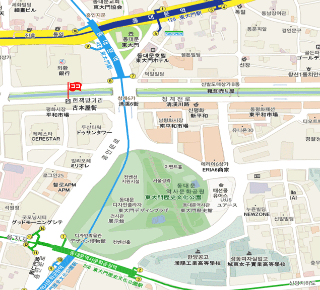 現地 アクセス      地下鉄 1·4号線の東大門駅 (No.128 · No.421 トンデムン・Dongdaemun)で降りて、
