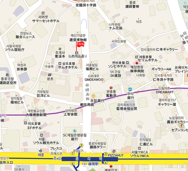 現地 アクセス  地下鉄 1号線の鐘閣駅 (No.131 チョンガッ・Jonggak)駅で降ります。