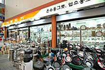 韓国料理が好きな人の中には、自分で料理を始めている人も少なくないと思います。日本で韓国料理を作ろうとしたとき、本場の材料と調理器具が問題になりますね。最近は、インターネットの発達で、食材も調理器具も簡単に手に入るようになりました。でも、高い! 韓国料理の調理器具を安く手に入れたい人にお薦めしたいのが、国際市場にある「徳成陶器 (トクソンドギ)」です。石鍋から始まって、鉄板までいろいろな調理器具が用意してあります。また、韓国料理に欠かせない食器類もここですべて揃います。価格も日本の3~5割も安い! 時間を割いて、ぜひ、立ち寄ってください。