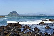 松岳山陣地洞窟前の海岸は火山島の海岸らしく、黒い石がゴロゴロした荒々しいイメージの自然が広がっています。また洞窟のある松岳山は高さ104メートルほどのなだらかな山で、山の上でもドラマ「チャングムの誓い」の撮影が行われました。山の展望台からは韓国最南端の馬羅島(マラド)と加波島(カバド)も見え、また国内最高峰であり、韓国では珍しい火山である漢拏山(ハルラサン)も眺めることができます。更にお椀をひっくり返して作ったような標高395メートルの岩山である山房山も眼前に見え、松岳山からの風景はまるで一枚の絵を見ているようです。ドラマに興味のない方でも必見のビューポイントといえます。