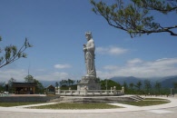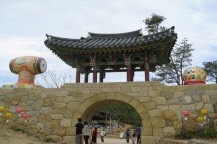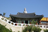 洛山寺(ナクサンサ)は、観世音菩薩が降り立つ山とされる五峰山に位置する古刹で、新羅時代の671年に義湘大師によって創建されたと伝えられています。中国.唐で仏教を学んだ義湘大師が新羅に戻り、勤行を行っている際に現れた観世音菩薩の導きによってこの地に開いた法堂がはじまりとされています。境内には広い空間の中央に置かれた東洋最大の大きさを誇る観世音菩薩像や、朝鮮第7代国王.世祖(セジョ)の時代に造られた七層石塔、虹霓門などの文化財があります。創建以来、度々再建を繰り返してきましたが、2005年4月に起こった大規模な山火事によって多くの殿閣が焼失し、景観が大きく損なわれてしまいました。現在では全国からの募金により元来の姿を取り戻しつつあります。
