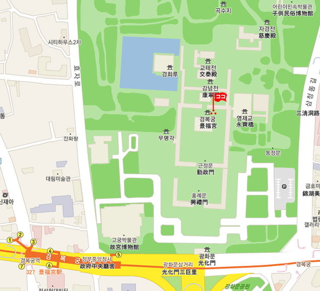現地 アクセス  ①地下鉄 3号線 景福宮 (No.327 Gyeongbokgung) 駅 5番出口から徒歩5分。