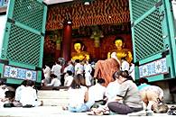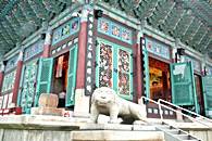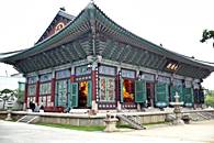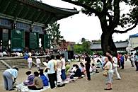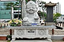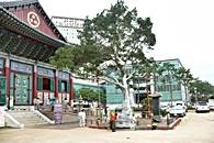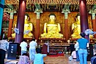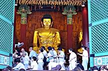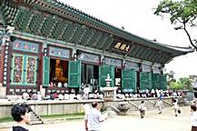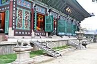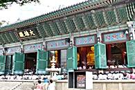 本殿である大雄殿は1938年に建てられたもので、たいへん雄大な建物です。この本殿の中では懸命に仏を敬い、祈りを捧げる人々の姿が見られます。膝をついて礼をしては立ち上がるという五体投地という作法を何度も繰り返します。一心に祈る信者の姿を見ると、人々に密着した韓国仏教の姿を感じることが出来ます。この曹渓寺の境内と周りには仏具用品店もありますので、記念品などを買うのにも便利です。韓国のお経のCDなど、ちょっと変わったものや作務衣に似た簡易韓服なども販売されています。