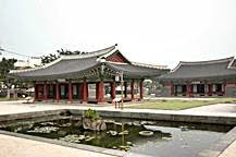 発掘過程で確認された礎石・基壇石を土台として「済州牧官衛」復元の基本設計が始まり、1999 年に着工、2002年に復元工事が完了しました。済州に現存する最古の木造建築物である「観徳亭」は兵士の訓練場として建てられたものでした。亭内には「一所懸命弓矢を訓練することは、徳を磨くことである」という意味の「射以観徳」の文字が掲げられています。復元された済州牧官衛には当時の牧使達の生活の様子が内部の様子とともに展示されています。